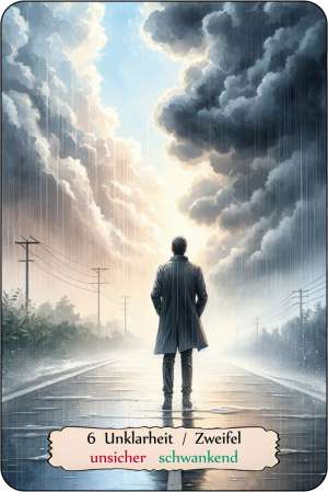 Als Tageskarte weisen die Wolken auf Unklarheiten oder Stimmungsschwankungen hin. Es könnte sein, dass sich etwas nicht so entwickelt wie erwartet oder dass du heute besonders achtsam kommunizieren solltest.