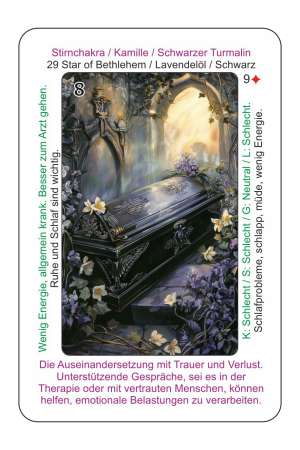 Der Sarg ist die achte Karte im Lenormand und steht für Abschied, Abschluss, Transformation und oft auch für gesundheitliche Themen. Diese Karte zeigt, dass etwas zu Ende geht, damit etwas Neues entstehen kann. Der Sarg ist eine Karte der Wandlung, auch wenn sie sich manchmal schwer anfühlt.