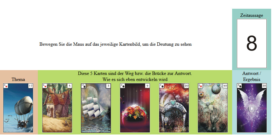 Es geht um eine eigene Frage, die ich im Video live beantworten werde. Also die Legung wird live gemacht und die Karten dazu am Bildschrim gezogen.