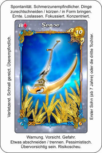 Hier bedeutet die Lenormandkarte Sense meistens, dass man vorsichtig sein muss, weil Dinge plötzlich überraschend passieren oder gar verletzend sein können.